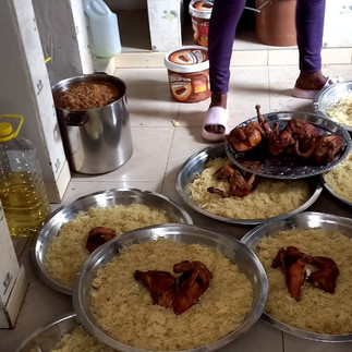 La fête s'est fini avec le partage d'un délicieux repas: poulet yassa aux vermicelles ! Et la distribution pour tous d'une boisson et d'un paquet de biscuits.